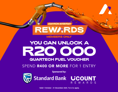 One lucky Astron Energy Rewards member could be rewarded with an exclusive R20 000 digital fuel voucher sponsored by UCount Rewards.